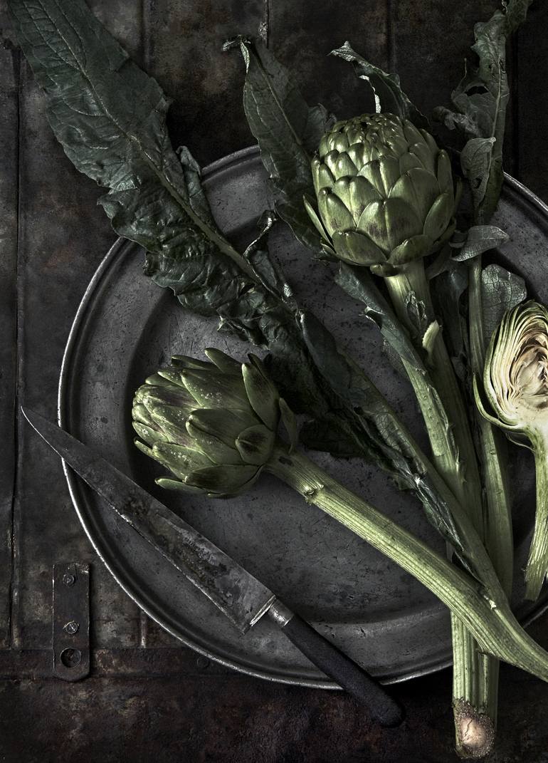 This image is part of a series of still life images of vegetables shot with side lighting to bring out the shape and texture of the subject. These artichokes were sourced from a local organic farmer's market in Sydney and laid down on a metal plate and a pressed metal background that was originally ...