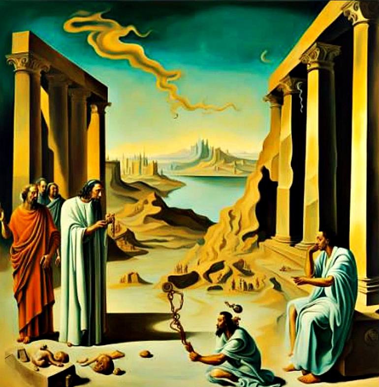 The A.I. created interpretation from my description of a group of classical figures stands within a surreal, architectural landscape with sand-strewn floors and an expanse of water in the distance. The figure of Ascelpius seems to be addressing another who sits on steps, while a third kneels with br...