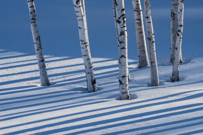 Aspens cast long shadows on freshly fallen snow. All large prints are an edition of 3, and are available in 20x30, 32x48, 40x60 & 48x72 (or similar size depending on the format of capture). All images medium format film camera or D850, and prints provided will be on top quality archival paper wit...