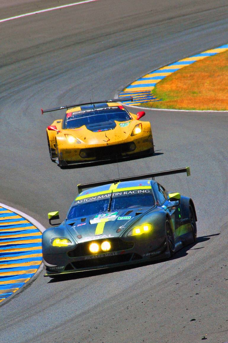 Aston Martin Racing, racing an Aston Martin Vantage no97 and Corvette Racing-GM racing a Chevrolet Corvette C7.R no 64 at the 24 Hours of Le mans endurance race 2017 in France photography by Andy Evans Photos. Limited edition prints are processed using Hahnemuhle Baryta fine art paper. A bright whit...