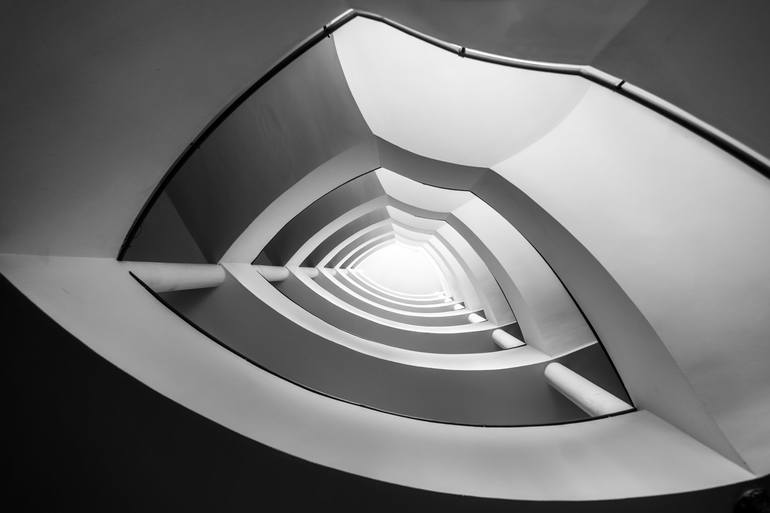 The asymmetic design, paired with a twist and the clean surfaces, reflecting the natural light in all shades of grey, from black to white, pointing to a center far, far away.