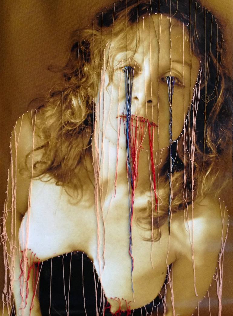 Je suis une femme artiste, mon travail s’articule autour de plusieurs techniques. Au commencement il y a la gravure que je découvre enfant. Au fil des ans, en parallèle à la gravure, je peins, Puis depuis une dizaine d’années, je brode et je tisse. En fait j’assemble et je mixe ces différentes techniques, puisque je brode sur mes gravures, ou, je tisse sur mes peintures, tout ça sur différents supports ( toile de Jouy, papier-bulle, photographies, calques, sérigraphies …) Ce qui fonde mon travail c’est le trait. Le trait en tant qu’empreinte, lien, vibration ou trame. Le trait sillon gravé dans la plaque, le trait de surface, dessins et peintures, ou le trait-fil fait matière. Mon travail invoque des corps et des portraits d’hommes, de femmes, des paysages, des figures références de l’histoire de l’art, des autoportraits, au travers de trames et de superpositions….