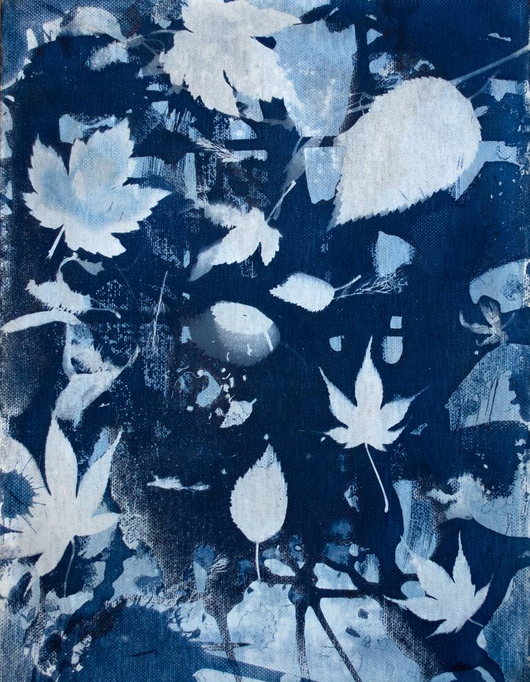In the true spirit of autumn this piece was created by the wind for the most part. After sensitizing the canvas with cyanotype solution with a random application, it was then left overnight near trees ready for the autumn leaves to fall and land onto the surface. This was then secured in place with ...