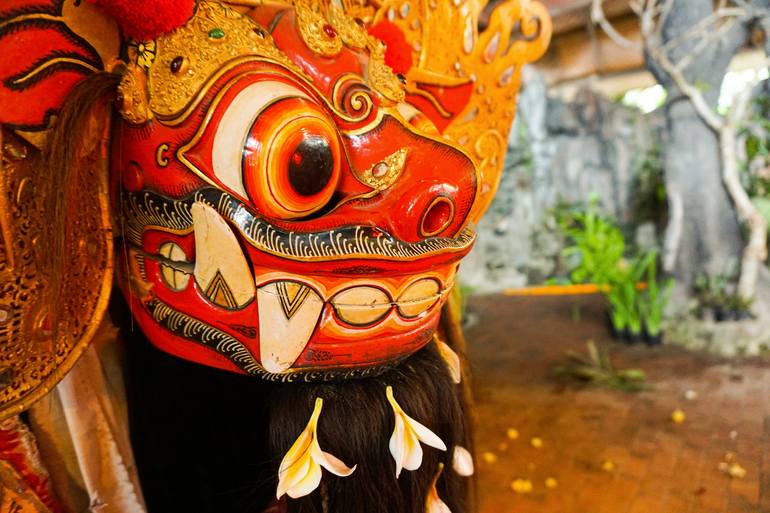 "A photograph of a Barong mask with intricate and meaningful traditional Balinese art ornamentation, a historical cultural heritage."