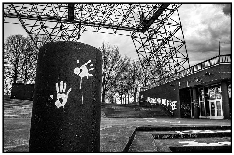 The black columns and walls of a concrete amphitheater are marked with graffiti inspired by the Black Lives Matter movement—such as these hand prints and the writing “Be strong be free...and support each other.” (April 2021, Martin Luther King Jr Memorial Park, Rochester, NY) View my other photogra...