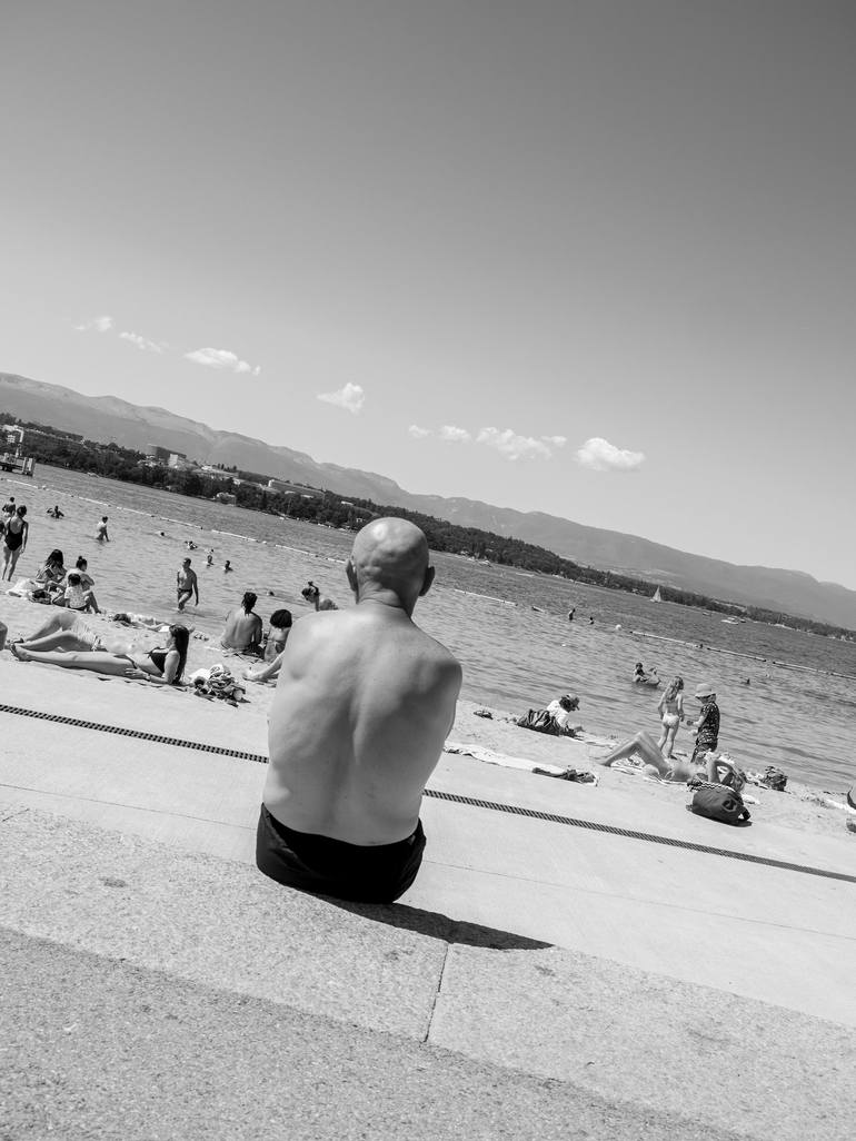 Admiring the View at the lake beach in Geneva, Switzerland. Original Photo Print Under Acrylic Glass Fuji Crystal Archive, glossy Acrylic glass 2 mm glossy Dibond 3 mm Aluminium rails