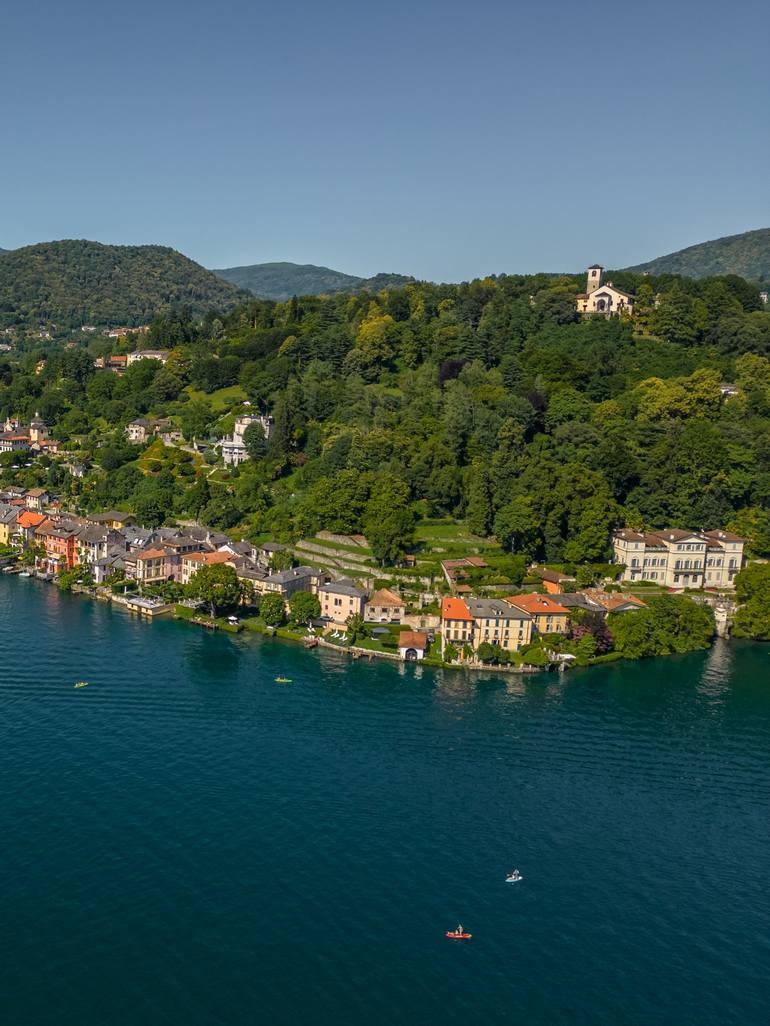 Drone photography. Beautiful drone view of the city of Orta San Giulia. Photographer: ANDREY DOMANIN. The original idea for your home or office interior.