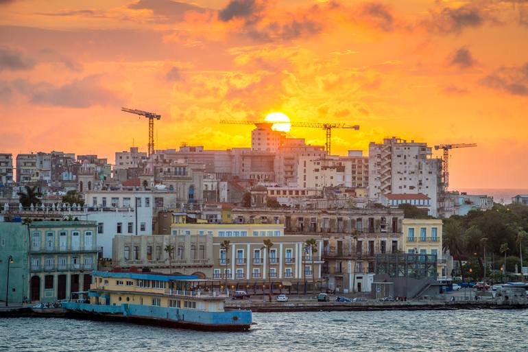 A view of Havana Cuba at sunset from aboard a cruise ship underway. This was a "once-in-a-lifetime trip" according to my travel companion and I think she was right. The Cuban people are unforgettable. The print comes ready to hang with an exhibit mount with black inset three quarter inch metal frame...