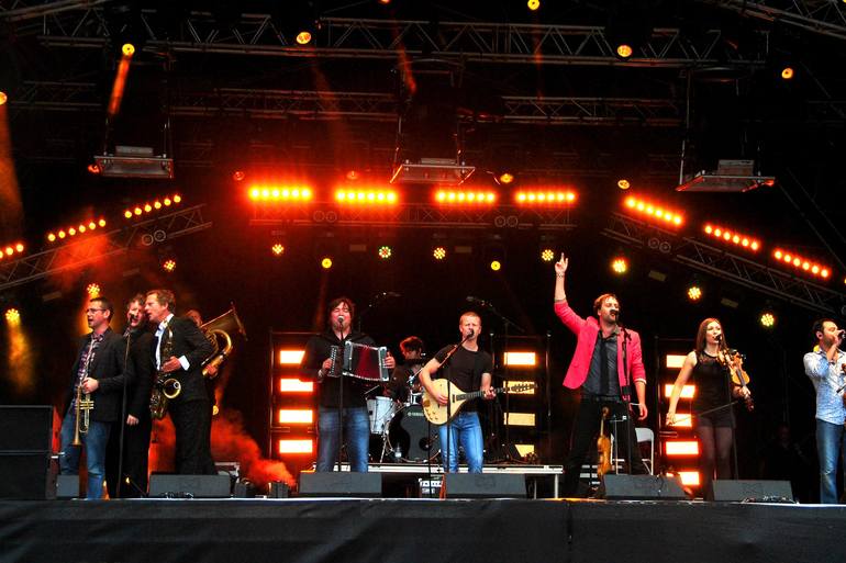 Bellowhead English folk band performing live in concert at Carfest South Overton Hampshire England United Kingdom photography by Andy Evans Photos. Limited edition prints are processed using Hahnemuhle Baryta fine art paper. A bright white based, acid-free and lignin-free paper benefiting from a hig...