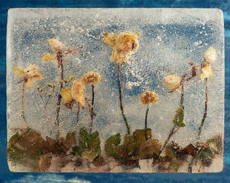 These flowers were a gift from my wife for my birthday, and I froze them into this block of ice after drying. The petals might be meek, but they dance appearantly vigorously in the sparkling space of the block of ice. The roses are joined by other flowers as well, and I almost believe I can hear mus...