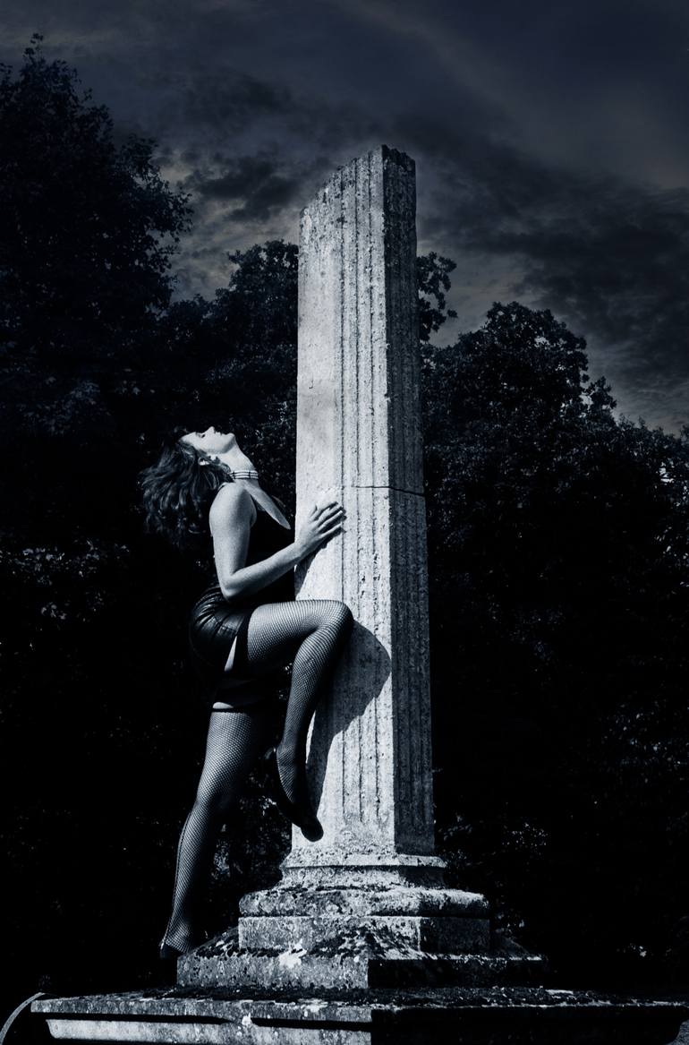 Fetish girl on graveyard monument. This erotic photograph is a digital montage composed from film and digital originals. Sexy and erotic without being blatant this image amuses and stimulates the viewer