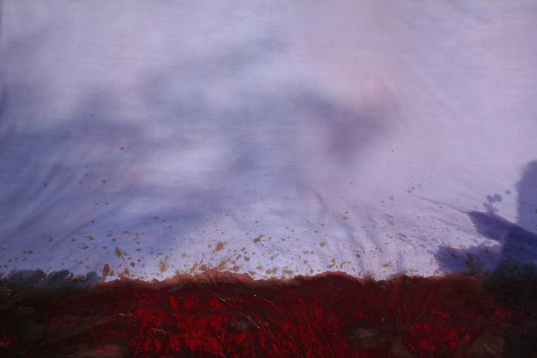 The dream of love and peaceful togetherness leads end up with a "Bloody Horizon" into reality - a landscape of dark-coloured fabric panels with a horizon of spilled blood reminding of the violence in our world. This photograph was taken immediately after completion of the work.
