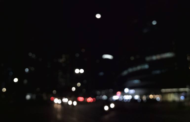 A distant view of city lights at night, softly blurred into abstract glowing spots. The out-of-focus effect transforms the urban landscape into a dreamy pattern of warm and cool tones. Capturing the essence of a city after dark, this photograph creates a sense of mystery and calm, leaving the viewer...