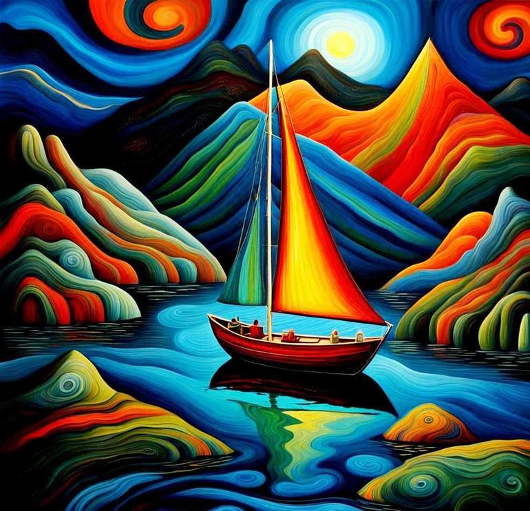 A.I. created print of a vibrantly coloured boat floats and is reflected on a serene body of water within a fjord, surrounded by steep, vividly painted mountains under a radiant sunset.