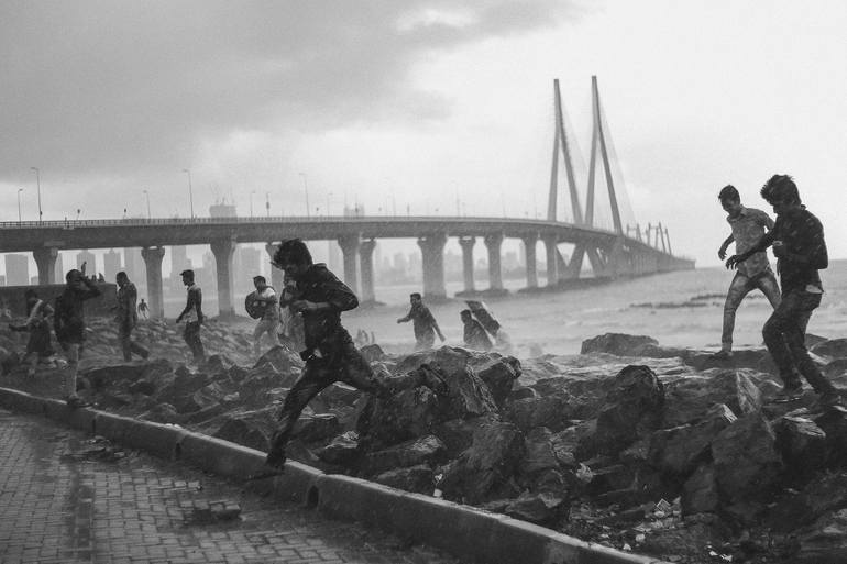 IMAGE This image was taken in Mumbai, while I was on a 2,5 year long nomadic journey by hitchhiking from Lithuania to India. The picture depicts people running for cover from the sudden monsoon downpour at at Bandra fort. Bandra-Worli Sea Link bridge is seen in the background. PRINT This photogra...