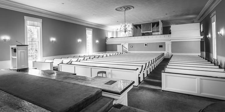 Black and white image of the interior of the historic Bothwell Chapel, one of the keystone structures at McKendree University.