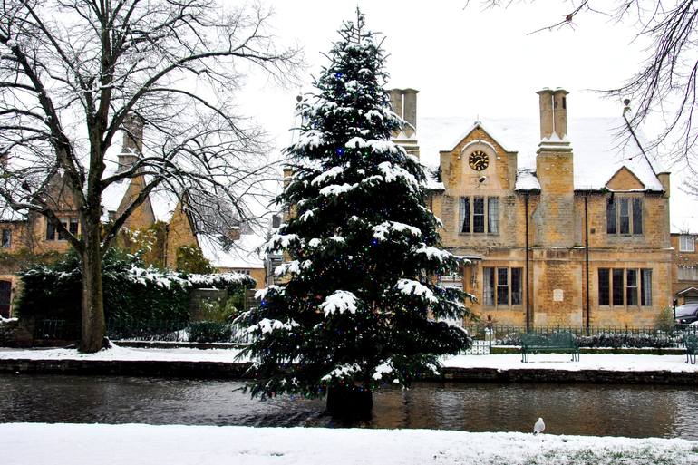 Christmas tree in the river Windrush in Bourton on the Water Cotswolds Gloucestershire England United Kingdom photography by Andy Evans Photos. Limited edition prints are processed using Hahnemuhle Baryta fine art paper. A bright white based, acid-free and lignin-free paper benefiting from a high-gl...