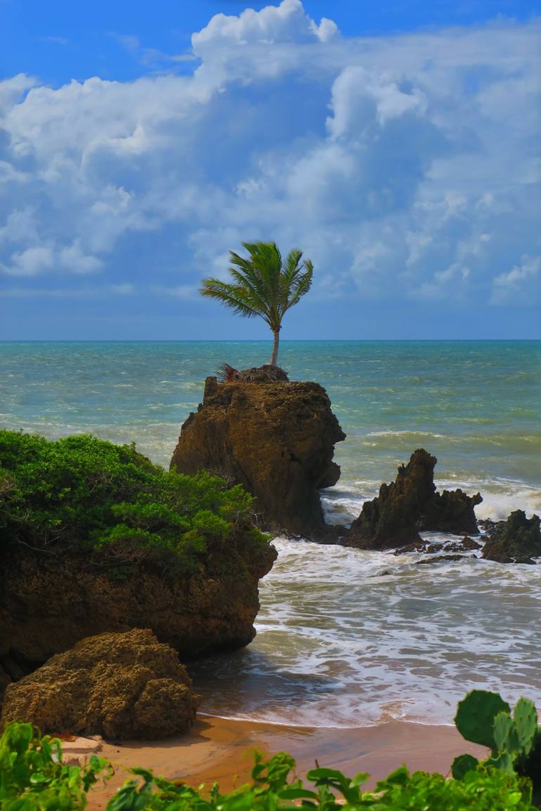 The iconic resilient palm tree growing on the top of a rock at Tambaba beach