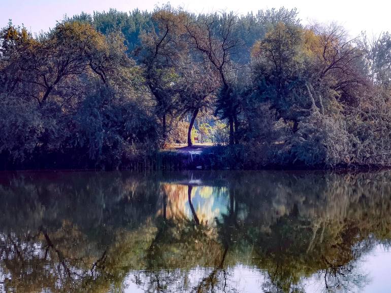 This is a large digital photo. It's like a painting. Breath of Calm: When the picture was taken, I didn't know what to do with it. I've been saving it for years, trying to figure out what to do with it. I always had a feeling for him that calmed me down. The bench that can be seen behind the bushes...