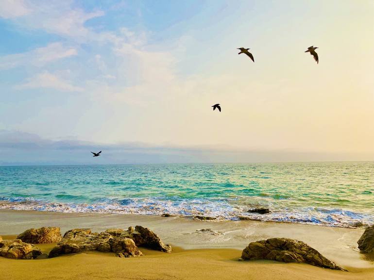 The birds seems so hopeful in their flight with the seascape as backdrop.