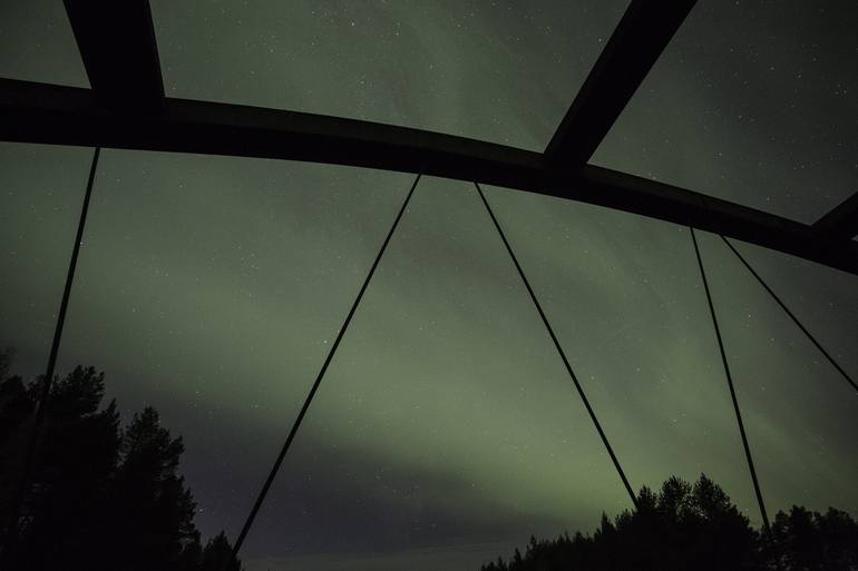 An old bridge in northernmost Sweden acts foreground to a smooth northern lights behind.