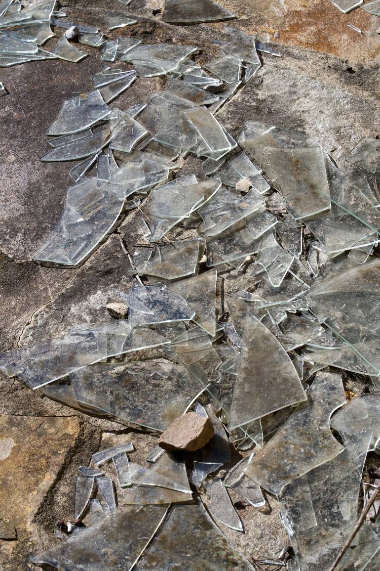 Photography of a stream of untouched broken shards of glass, layered in sunlight on a stone patio.