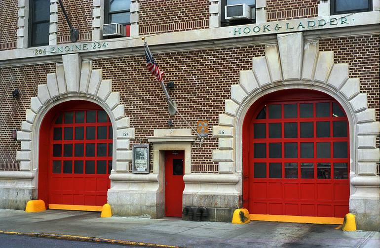 A Brooklyn fire station, hook and ladder. A classic film image, softer of focus with maybe some lovely film "grain".