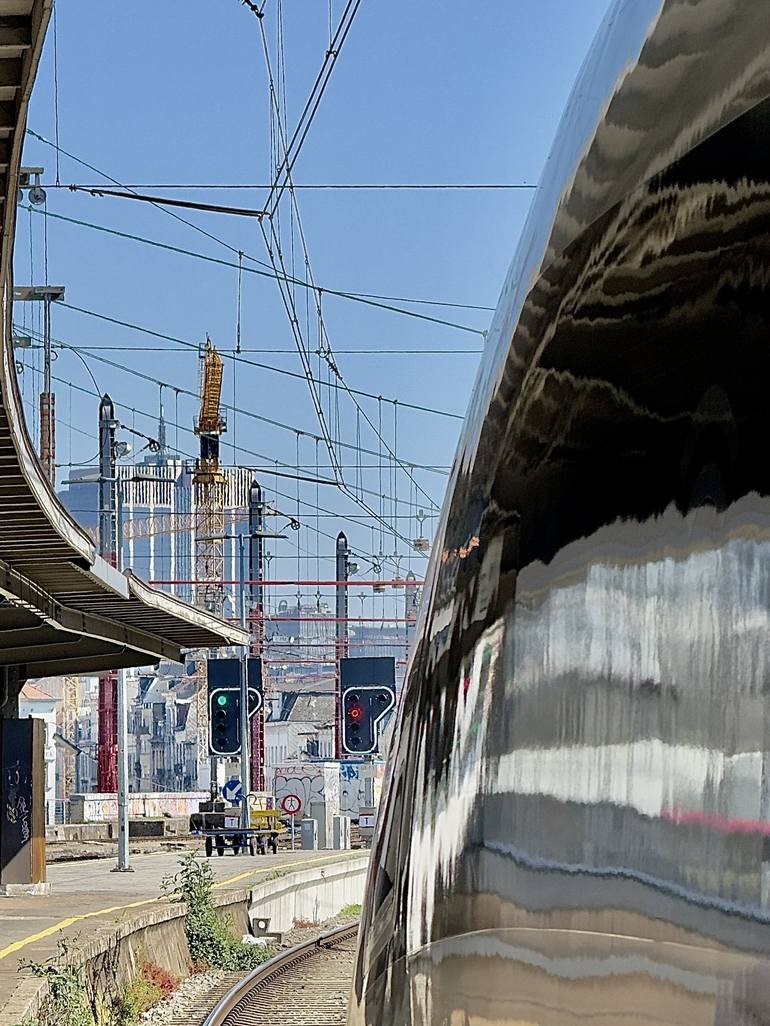 Waiting for my ICE to open doors at Brussels South (Bruxelles Midi or Brussel Zuid) my eyes find the urban green next to the rails, old buildings from the Marolles district and finally wander north to the Financial Tower. Good-bye and see you soon again.
