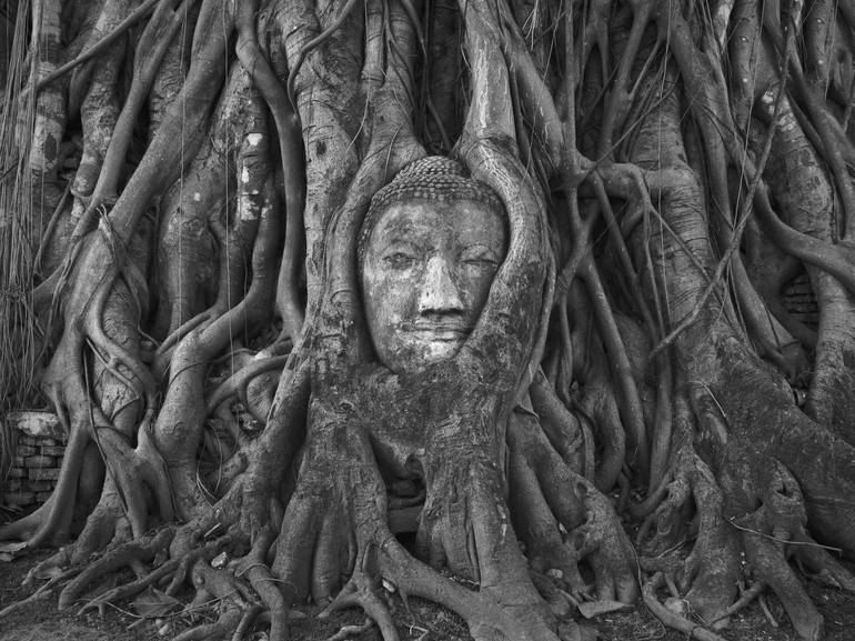 Buddha Head in Tree Roots, Wat Mahathat, Ayutthaya Thailand. This particular Buddha head is entwined within the roots of a tree and is one of Thailand's most recognizable images. The Buddha's head is located at Wat Mahathat in Ayutthaya. Printed on Fine Art Archival Paper and signed by Edwin Dato...