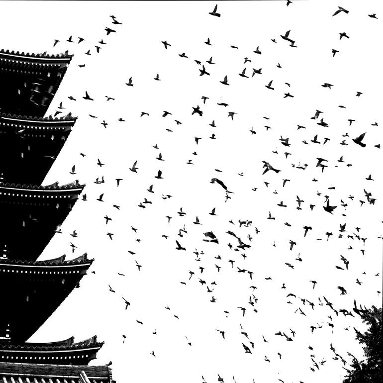 Birds fly over the roofs of Sensoji Temple, Tokyo, Japan
