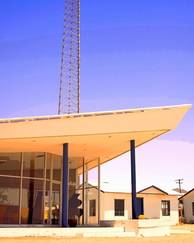 A midcentury modern structure at the iconic Roy's Motel on Route 66 Amboy, California captured by photographer William Dey. "Retro Vision" Art Exhibition Satellite Show Archangel Collective Art Gallery Palm Springs, California. Image is printed on crisp white matte Picture Rag museum-quality paper ...