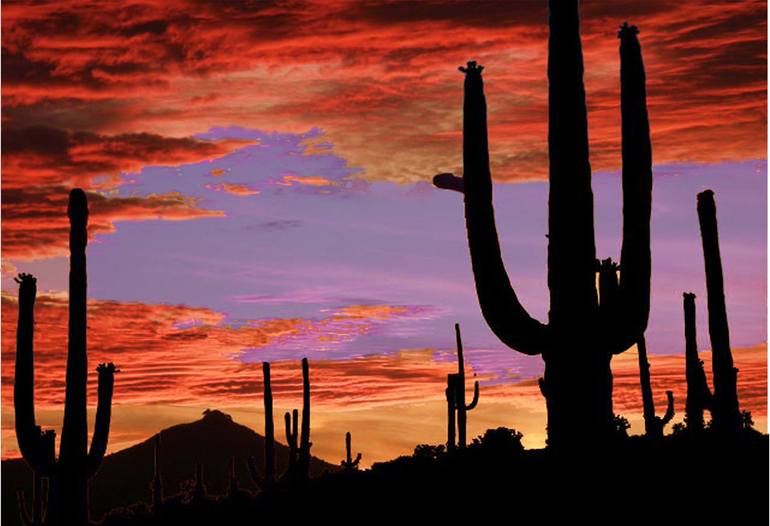 Saguaro cactus silhouetted by a brilliant sunset. Digital art with enhanced colors.