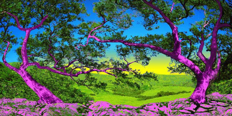 This beautiful photographic artwork, "California Pink Oaks," is a digitally enhanced piece of fine art. Created for the "Jane Gottlieb Fantasy Gardens" exhibition in 2017, the artist has transformed a 35mm format into a captivating panorama. The work combines painting and digital techniques, resulti...