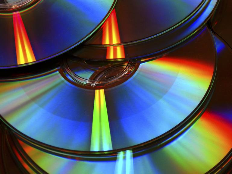 A collection of compact discs reflects in a spectrum of light with vibrant colors, overlapping in a cascading arrangement.
