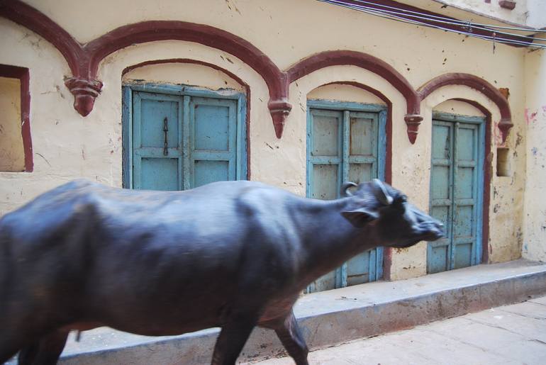 Cattle, running home in a narrow street after bathing in Ganges River, India Varanasi 2010 Lambda print on Kodak photo paper, 11.8 x 17.7 in (30 x 45 cm) Edition of 15. Signed, numbered and dated in pencil on back, with certificate of authenticity. This work will be shipped rolled in a secure tube.