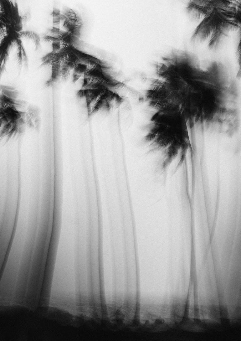 Ceylon Dreams, taken in Sri Lanka, captures the ethereal beauty of swaying palm trees in the soft, muted light. The blurred movement of the trees, rendered in monochrome, creates a dreamlike atmosphere, as if the scene exists between reality and memory. The tall palms stretch toward the sky, their s...
