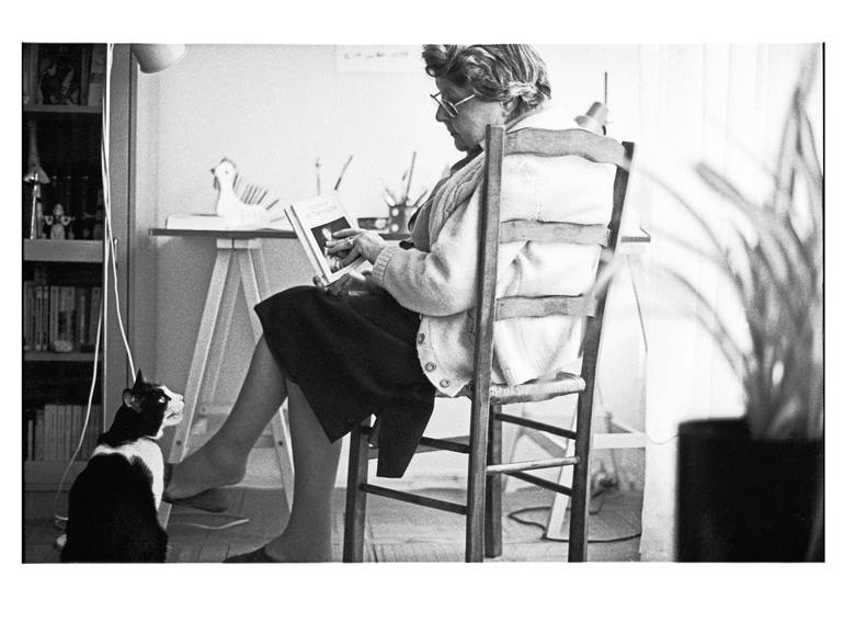 Black and White image photographed in Paris. A woman and her cat at home.