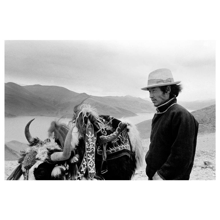 There is a Tibetan man holding a yak by the lake, asking tourists to take photos with the yak, and earn a living. 在湖邊有藏族男士牽著氂牛,招呼著遊客與氂牛合影,藉此賺取謀生的費用