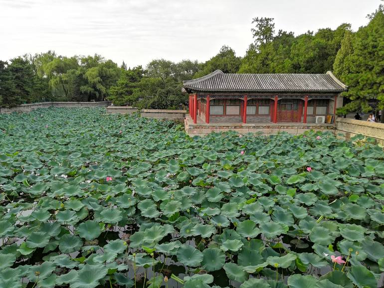 A tranquil summer day in Beijing, just outside the Forbidden City, where a serene pond is completely covered by lush green lotus leaves. In the middle of the pond, a striking red gazebo stands proudly. Among the dense foliage, a few delicate lotus flowers emerge, adding a touch of color to the peace...