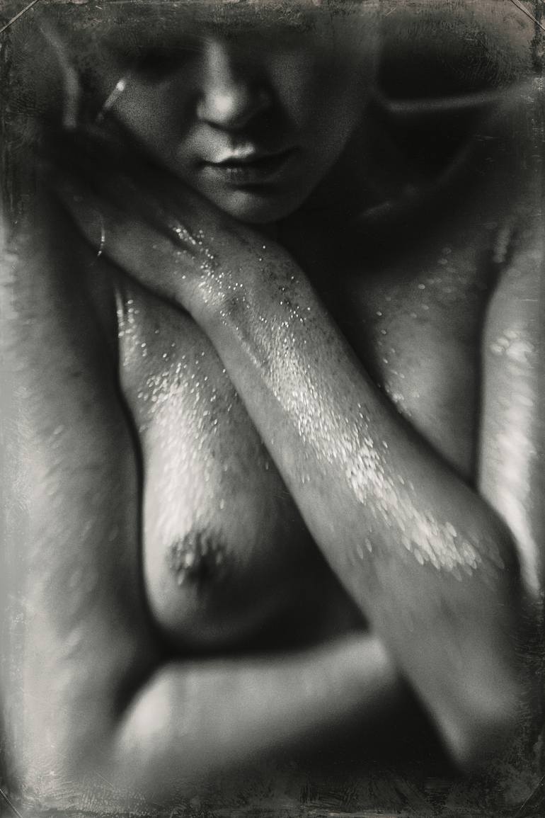 sensuality and expression of loneliness. naked woman body glittered. body paint. studio lights.