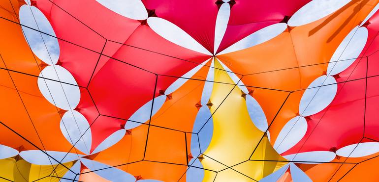 The roof of the main stage at the 2014 O.Z.O.R.A. Festival in Hungary. Looking up while dancing around I found the roof of the tent a very interesting motif with its graphic colourful shapes. A signed print from a limited edition of 10. Printed with a white border to accommodate framing/mounting ...