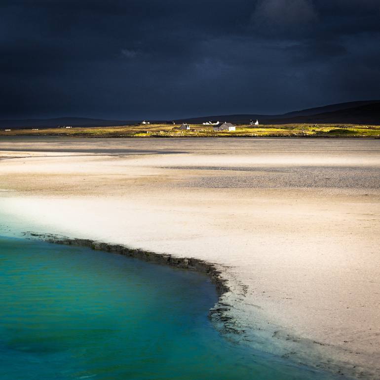 A colorful long exposure fine art photography print of the vivid waters and beaches of South Uist in the Scottish Highlands. The grass has already turned ochre and contrasts beautifully with the deep teal green of the pure mineral waters of the island. This is from my latest trip to the Isle of Ha...
