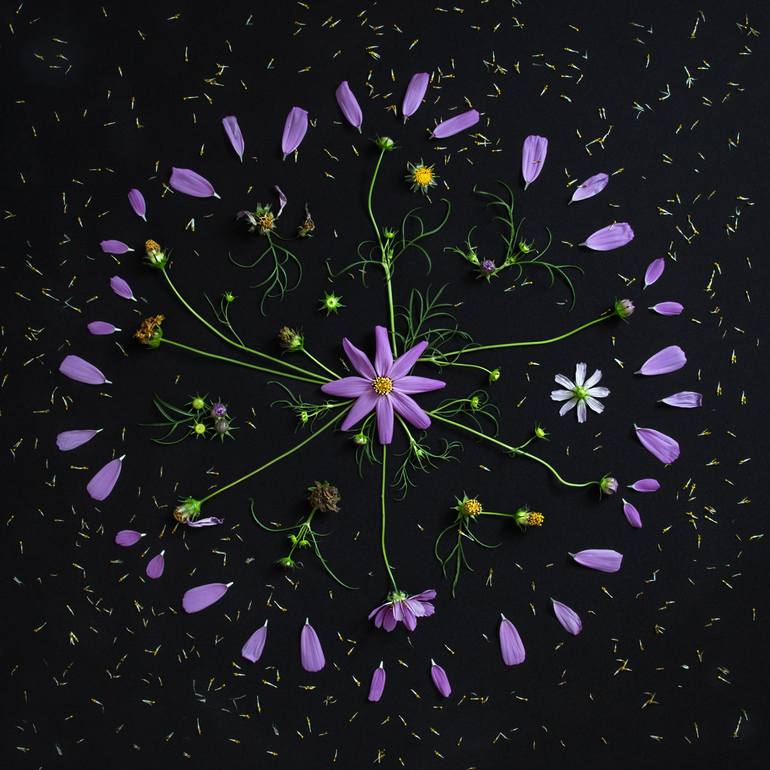 “Cosmic Bloom of Cosmea” is a fine-art botanical photograph from my Botanica series. The artwork features delicate lilac Cosmea flowers arranged on a deep black background, forming a radiant mandala-like composition. Petals, stems, buds, and tiny pollen fragments create a sense of movement, as if th...