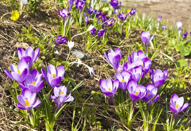First spring flowers purple crocuses on ground, photograph. Artistic produced limited edition prints of 100 pieces. Excellent printing quality. Printed on 100% natural cotton canvas 340 g /m2 with a pronounced texture. Eco-friendly ink without odor and harmful substances. Printing on the Canon iPF8...