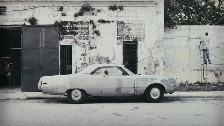 Documentary travel image from Havana, Cuba. A vintage American style automobile, that could do with a new paint job contrasted against a painter doing exactly that to a peeling painted wall. The desaturated nature of the piece gives a bygone look to the overall work. I felt printing the image onto m...