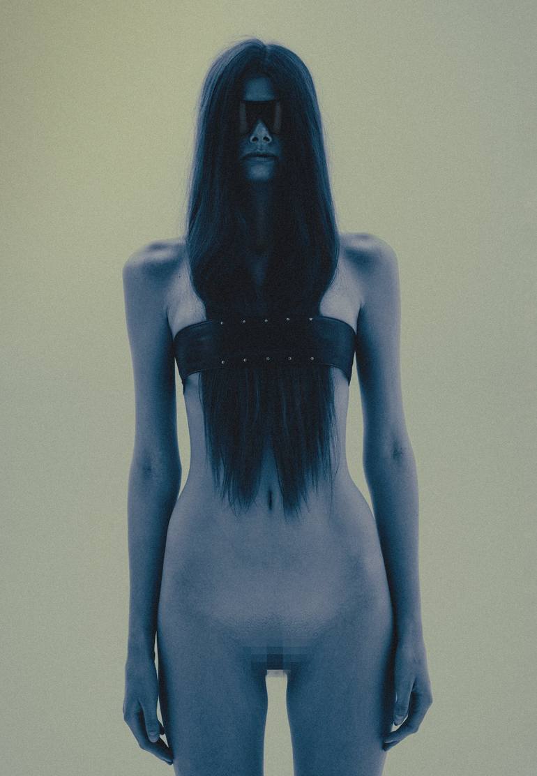 This artwork explores the boundaries of identity, the body, and technology. The figure, suspended between human and cybernetic states, dissolves into a minimalist space devoid of time and context. The cool, neon-toned color palette creates an atmosphere of detachment and futuristic aesthetics. Inco...