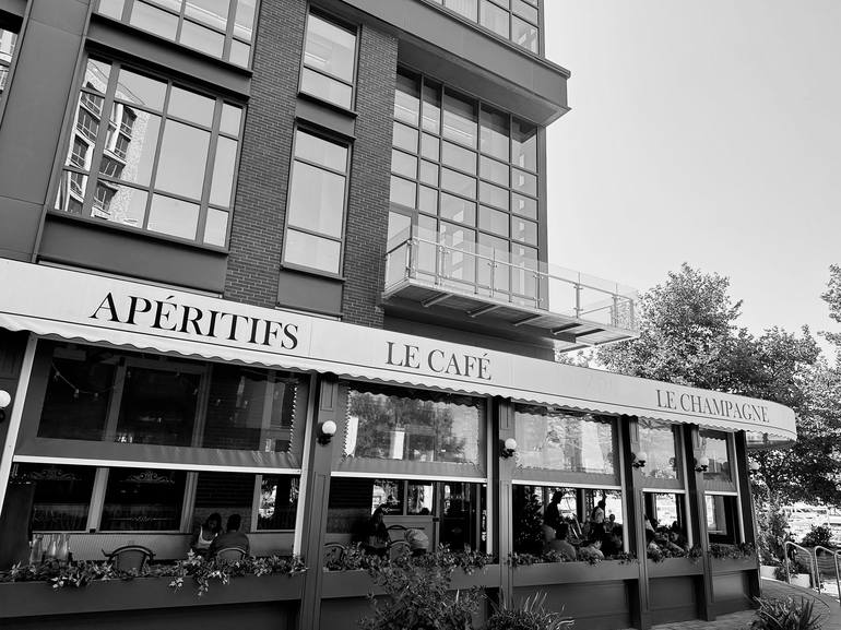 This evocative black and white photograph captures a quiet moment at a restaurant in Washington, D.C., taken during a visit for an acting gig. The stark contrast of the monochrome tones highlights the ambiance and architecture, while the image serves as a personal memento from a creative journey in ...
