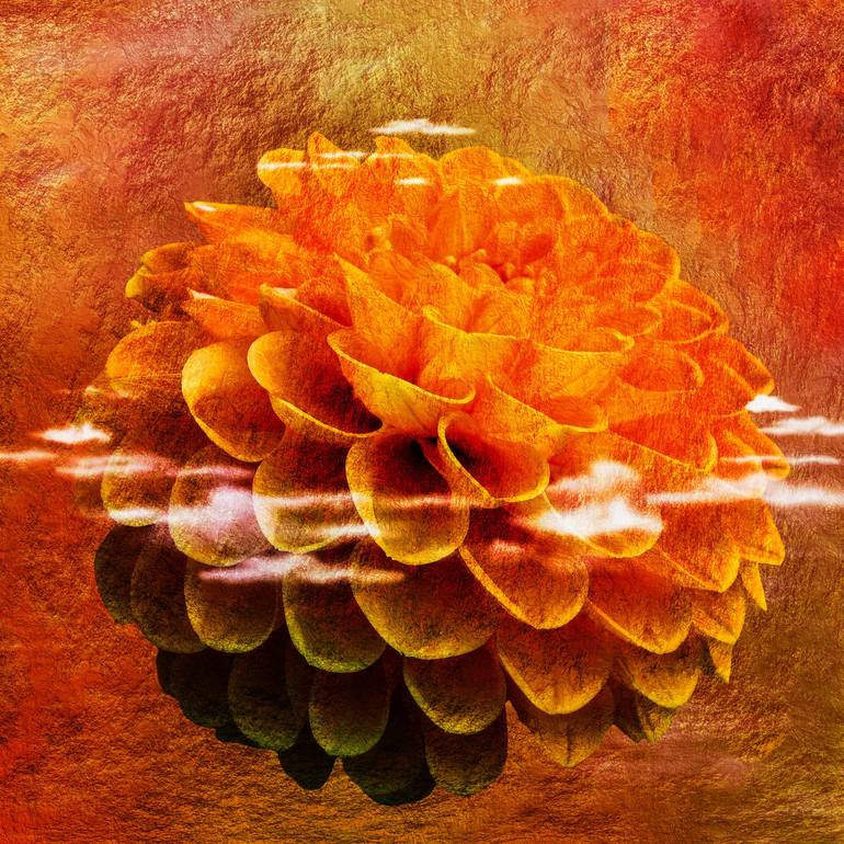 This photograph captures a stunning orange flower in full bloom, set against a richly textured background that exudes warmth and vibrancy. The petals are meticulously detailed, showcasing a gradient of orange hues that transition from deep, fiery tones to lighter, almost golden shades. The flower ap...