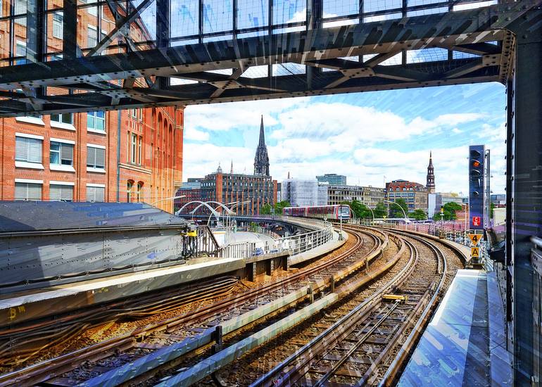 Digital art based on real photographs The elevated railway winds its way through Hamburg's port city like an urban river. The tracks curve gracefully, while in the background the distinctive church spires of the city center pierce the sky – a blend of history and modern movement. This image captures...