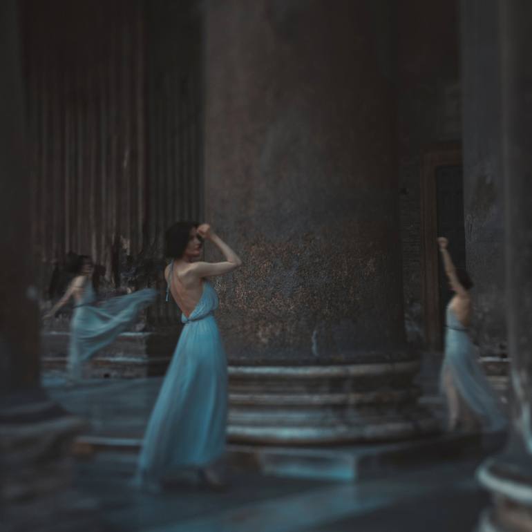 A dreamlike vision of a woman in motion, captured in the timeless embrace of ancient architecture. The blurred figures, draped in flowing blue, evoke a sense of fleeting presence, as if past and present intertwine in a silent dance. The interplay of shadows and soft focus adds a cinematic quality, i...